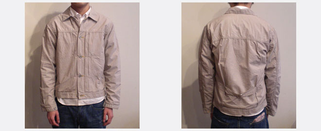 シャツ生地で仕上げたジャケットです。柔らかな綿100%のライナーをつけています。シャツを羽織る感覚でジャケットを羽織って頂けるよう考えており、デニムにも合わせれる部分もポイントです。左胸下に丸いポケット、バックにはシンチベルトが付いています。