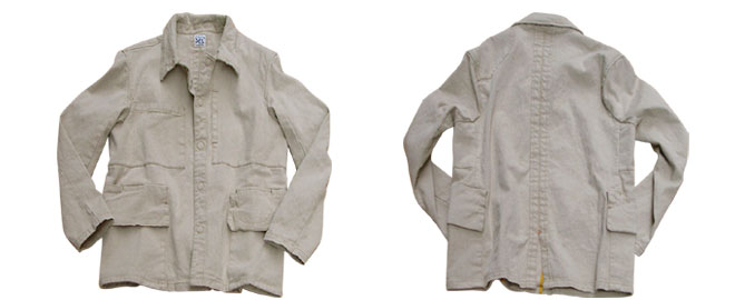 綿47%・麻53% の綾織りとなったやや細身シルエットのジャケットです。機能の便利性が高く開閉しやすいスナップのフロントボタン、大胆に付けられた左右で形の違う胸ポケット、更に右サイドのポケットは、フラップの上から雑誌などを差し込める仕様となり、左サイドはフラップ部分に携帯がおさまる程度のコインポケットがデザインされています。ステッチワークによる生地のパッカリングが良い風合いを出しています。 |