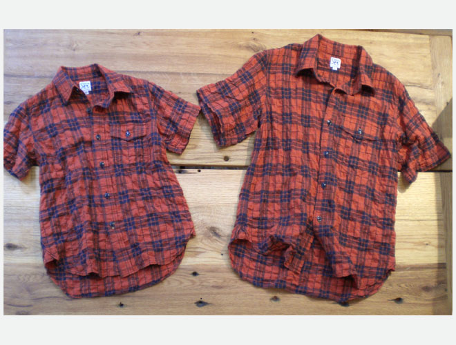 ガーゼのように薄手で柔らかいコットン素材のシャツです。レッド×ネイビーのチェックとなり、生地のシワシワっとした表情が特徴的です。胸部にフラップつきのポケットが付いており、各サイズごとにフロントボタンの一番下のボタンホールの色を変えています。
