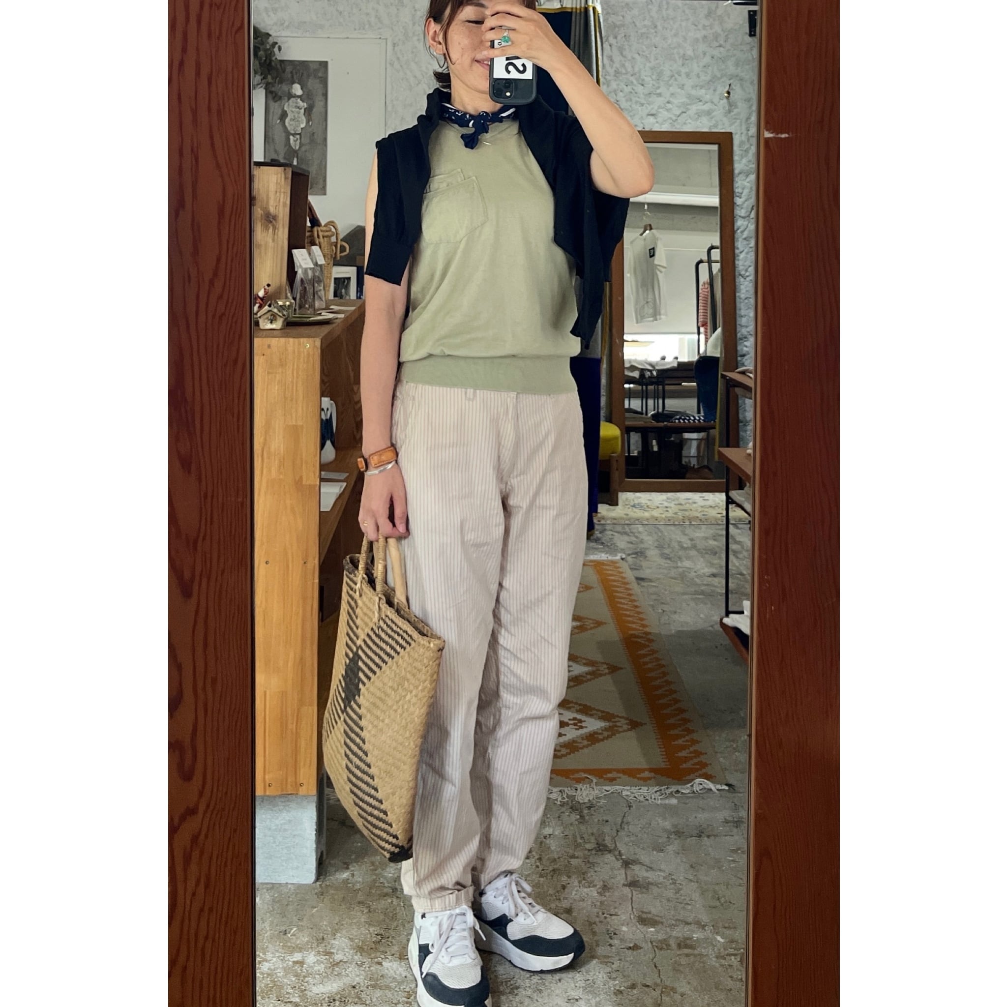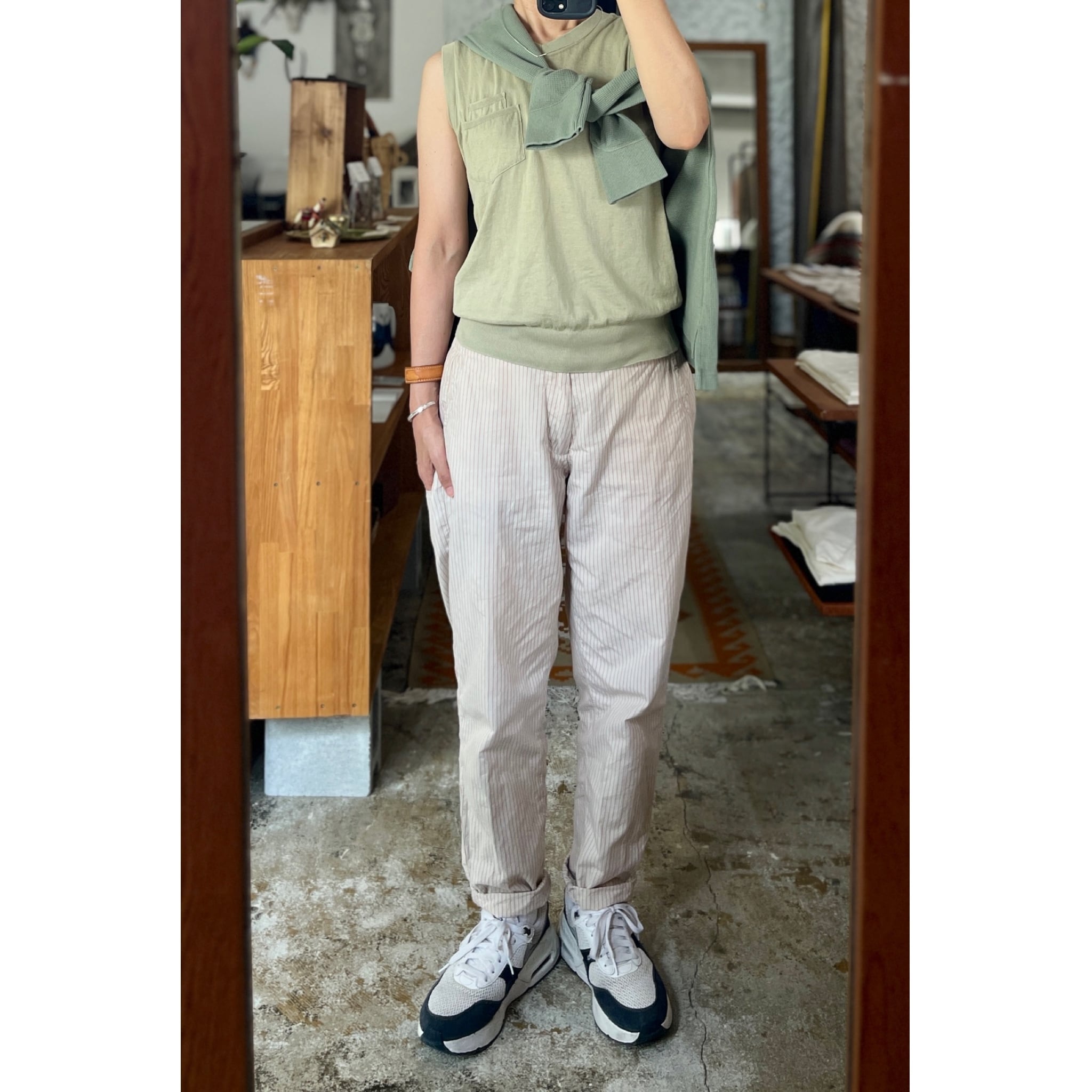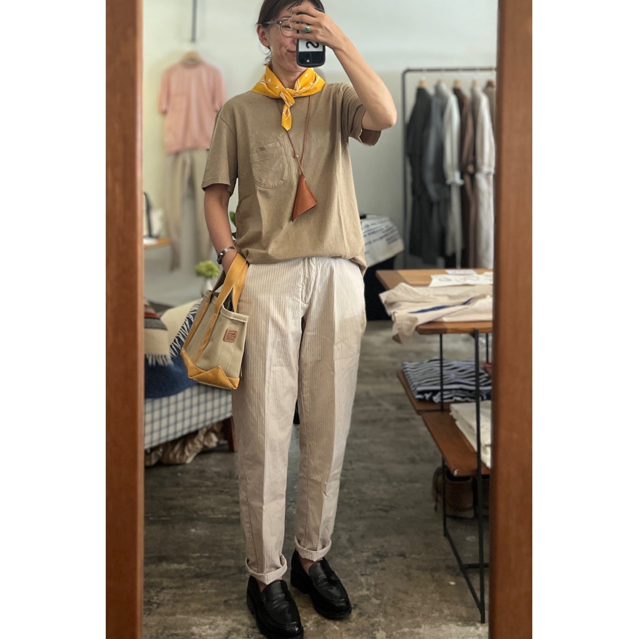 シルバーベージュにオレンジ、赤褐色のブラウンにオリーブのピンストライプを定番になっている綺麗目なラインのトラウザーです。