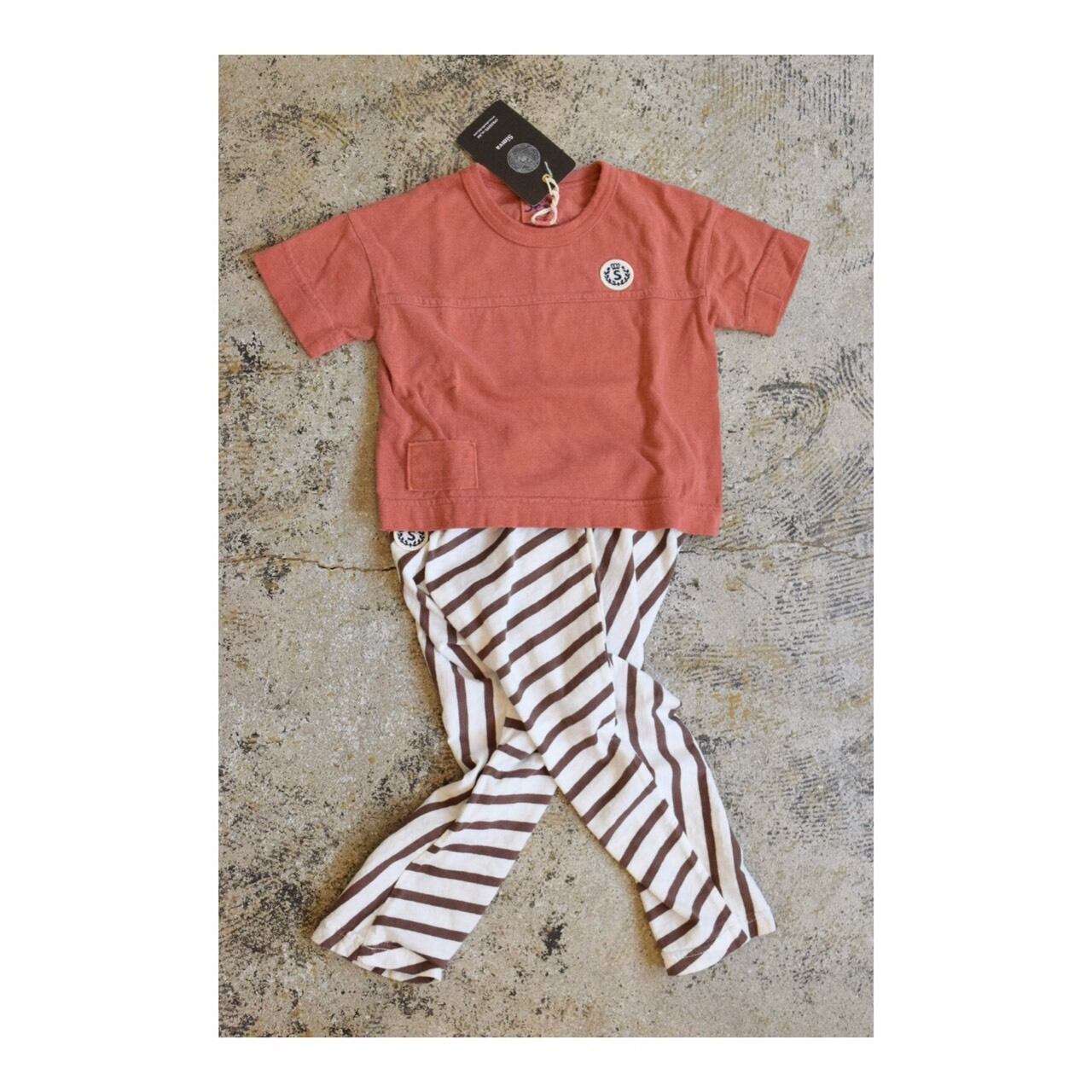 オキーフ定番の超長綿を使用したカットソーシリーズからキッズのサルエルパンツのご紹介です。毎年ボーダーの色を変えての登場ですが毎年大変ご好評いただいております。Tシャツ同様ジャージー素材ですのでストレスなく穿いて頂けクオリティーの高い綿100%は子供さんにとっては毎日穿いていたくなるパンツです。形もお尻周りにゆとりを持っているのでしっかり動くお子さんにもまたオムツをしておられるお子さんにも対応できるサルエルパンツです。デザインも生地をバイヤスで取って裁断しているため穿くといろんな縞模様が見られます。左足はボーダー柄と右足はストライプ柄、またお尻は斜め方向といった具合です。お尻にワンポイントのワッペンもかわいさをアップしています。Tシャツ感覚でどんどんお洗濯して繰り返し穿いて頂けるパンツです。