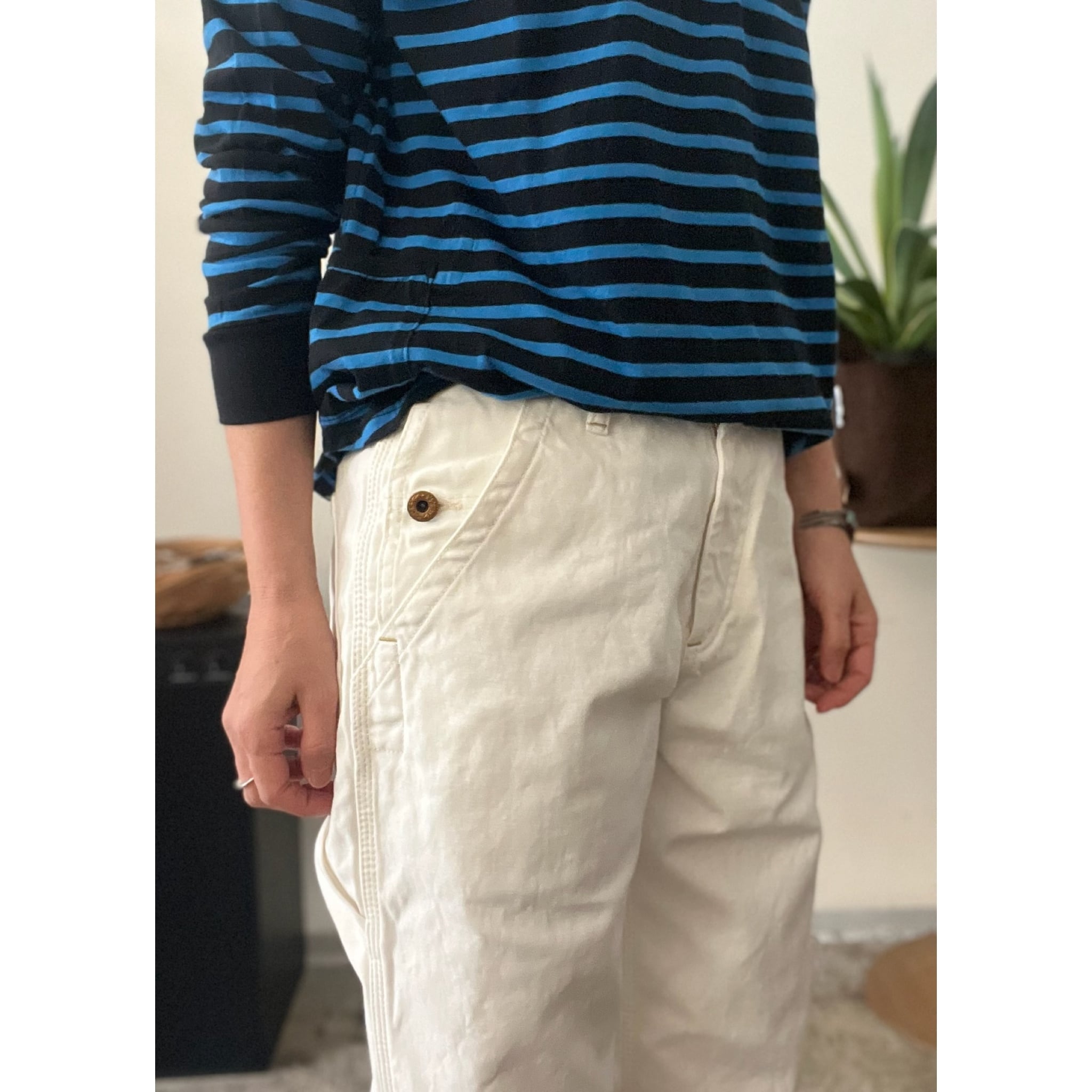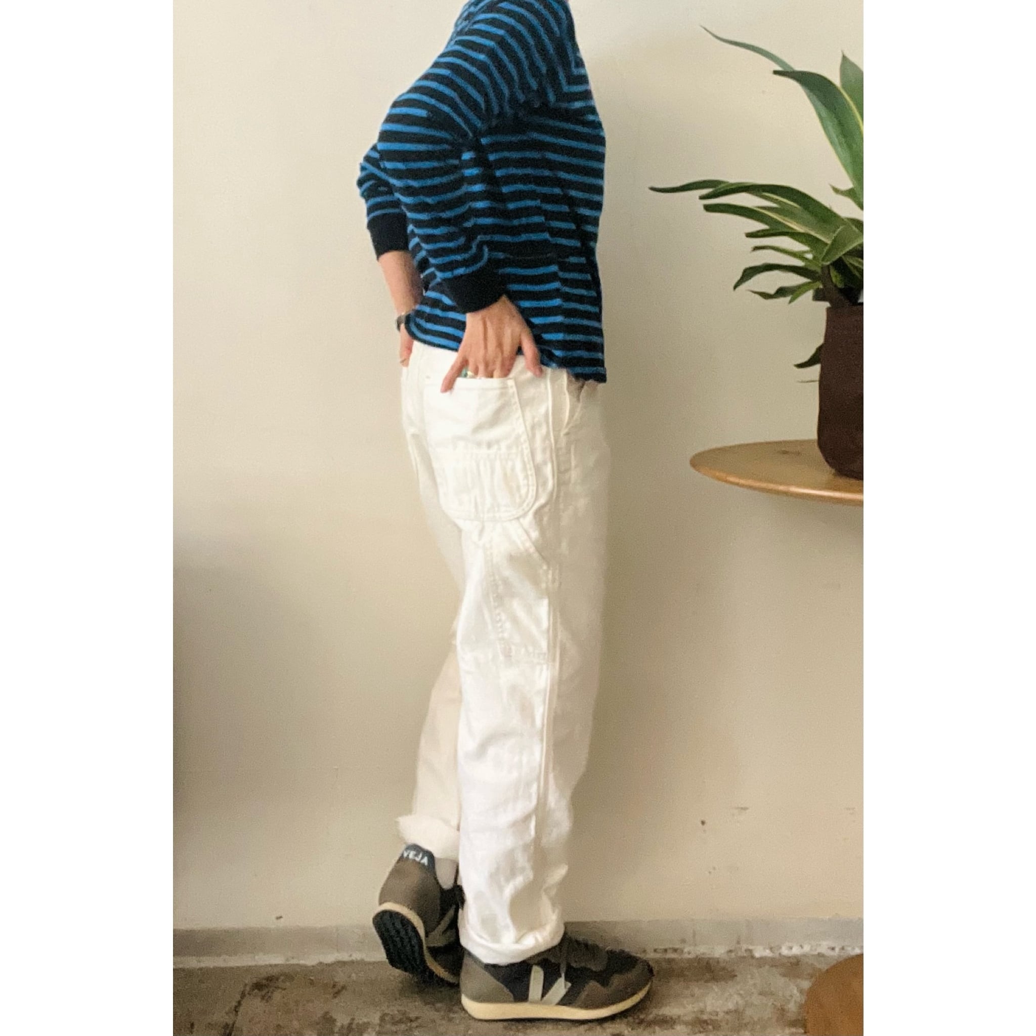 ペインターパンツについてですが、弊社オリジナルのペインターパンツの型を少しずつ修正をかけてのご紹介です。元々のデザインソースとなるペインターパンツに比べ、股上を浅くし膝上から裾にかけてテーパードをかけて全体的にすっきりとしたシルエットになっています。経年変化するアイテムを是非お楽しみください。
